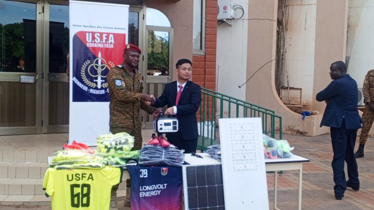 Ouagadougou, 17 septembre 2025 (Globinfos.net) – Les groupes Longvolt Énergie et COGEB ont procédé, ce mercredi, à une double remise de dons au profit de l’Union Sportive des Forces Armées (USFA) et des orphelins scolaires des Forces de Défense et de Sécurité (FDS). La cérémonie a eu lieu au Camp Général Sangoulé Lamizana, en présence du Colonel Hamed Herman Roamba, Chef d’état-major de l’Armée de Terre.