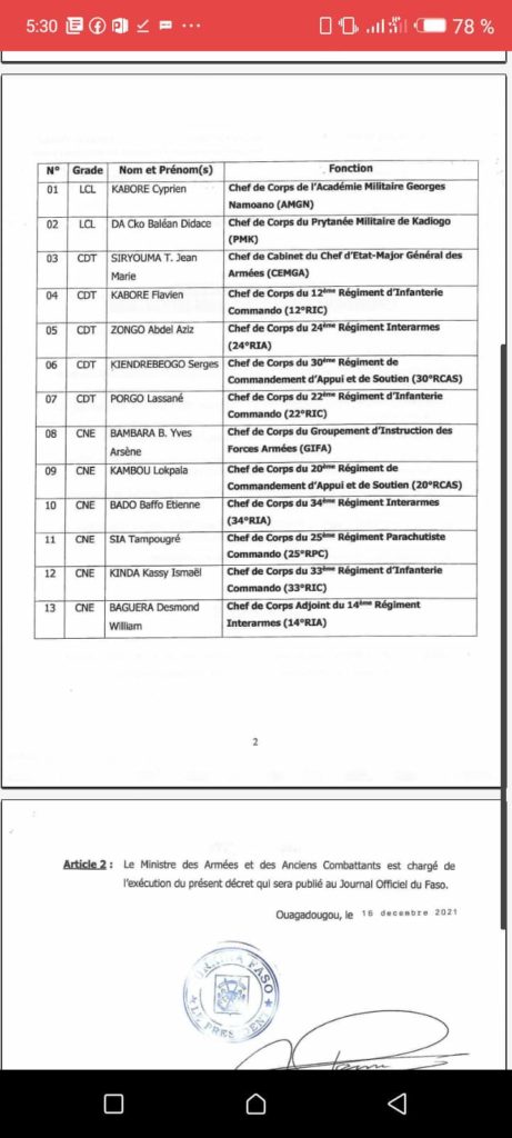 Ce jeudi 16 décembre 2021 le président du Faso Roch Kaboré a nommé treize nouveaux responsables au sein de plusieurs unités de l’armée, s’inscrivant ainsi dans le cadres des changements visant l’efficacité des troupes contre le terrorisme actuellement en pleine recrudescence au pays des hommes intègres
