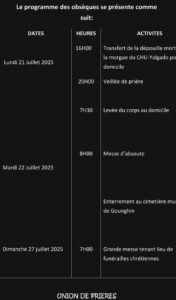 Décès survenu le Samedi 19 Juillet 2025 des suites de maladie au CHU Yalgado OUEDRAOGO à l’âge de 86 ans.