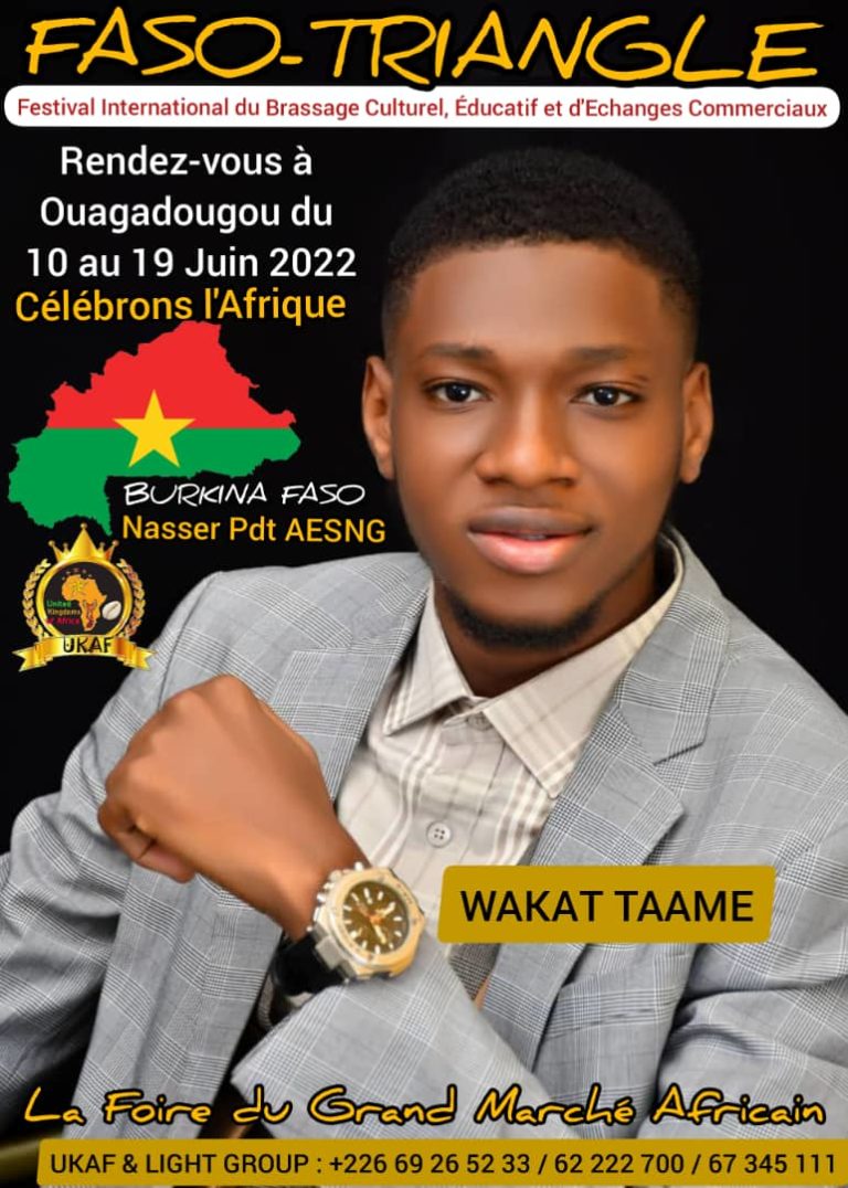 Sous le haut parrainage de Sa Majesté le moogho Naaba empereur des moosé, la Marraine d’honneur, Ho Samia NKrumah fille de feu Dr Kwame NKruma avec l’appui des autorités burkinabè et des pays d’honneurs dont, le Ghana, Guinée équatorial, le mali et Maroc, United kingdoms of Africa(UKAF) organise pour la première fois, au Burkina Faso, du 10 au 19 juin 2022 la journée de l’Union africaine, dénommée Faso-triangle à la place de la nation à Ouagadougou. Un Festival International du Brassage Culturel Éducative et D’échange commerciaux qui a douze ans d’existence, mais se déporte pour la 1ère fois au pays des hommes intègres, sous le thème : » un continent, une identité Wakat Taamee ». L’annonce à été livrée dans l’après-midi de ce vendredi 20 mai 2022, par le comité d’organisation en conférence de presse à Ouagadougou.