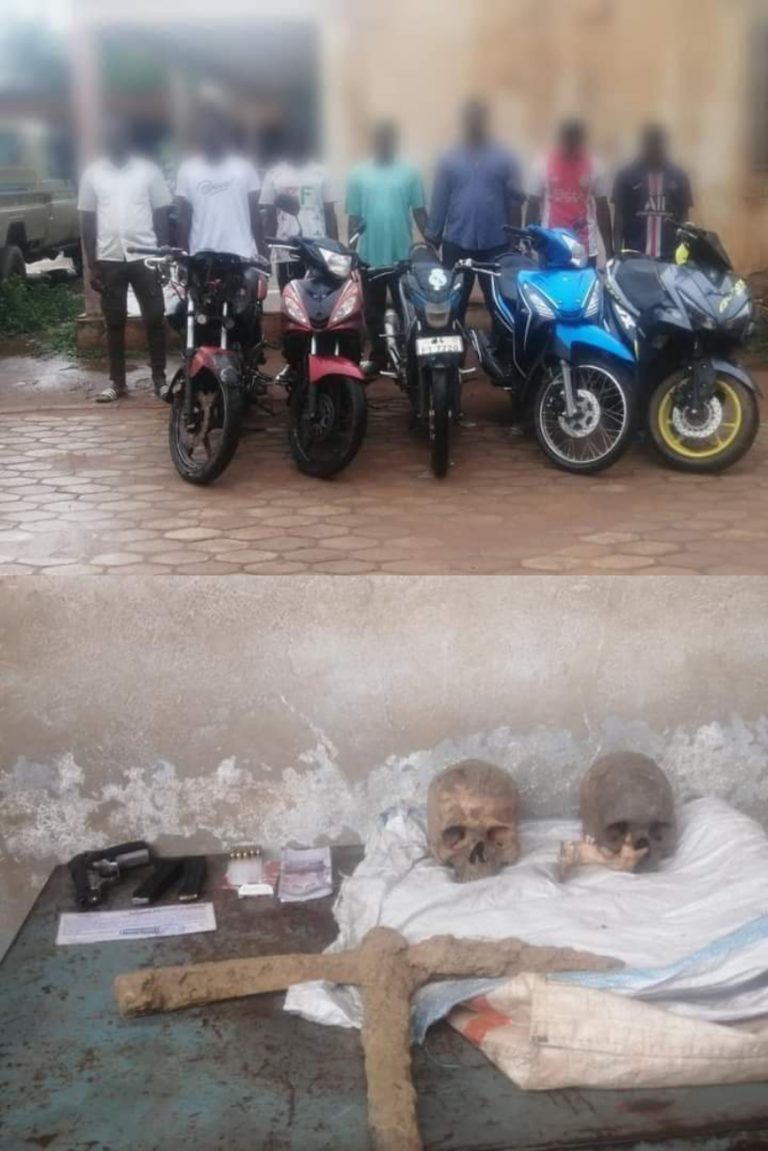 Deux crânes humains, un pistolet automatique, deux chargeurs de pistolet automatique, un paquet de munitions contenant dix-huit cartouches de calibre 7,65 mm, 5 motocyclettes et la somme de 830 000 FCFA ont été saisis des mains de ces malfrats après investigations », a récapitulé le commissaire et ses éléments.
