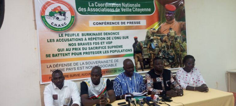 « Nous, représentants de la Coordination Nationale des Associations de la Veille Citoyenne avons appris avec consternation la sortie du Haut Commissaire aux droits de l’homme se disant préoccupé par l’augmentation du nombre de civils tués au Burkina Faso. Nous avons été informés que les représentants de l’ONU ont présenté leurs excuses aux autorités burkinabè par voie diplomatique et ont promis de régler le différend concernant les déclarations sur les meurtres de civils et les enquêtes relatives aux violations des droits humains. Nous tenons à clarifier notre position et à réaffirmer notre détermination à défendre notre souveraineté nationale.» , a d’emblée déclaré Assane Davy Ouédraogo porte-parole du jour pour la coordination face donc à la presse ce mercredi 5 juin à Ouagadougou.